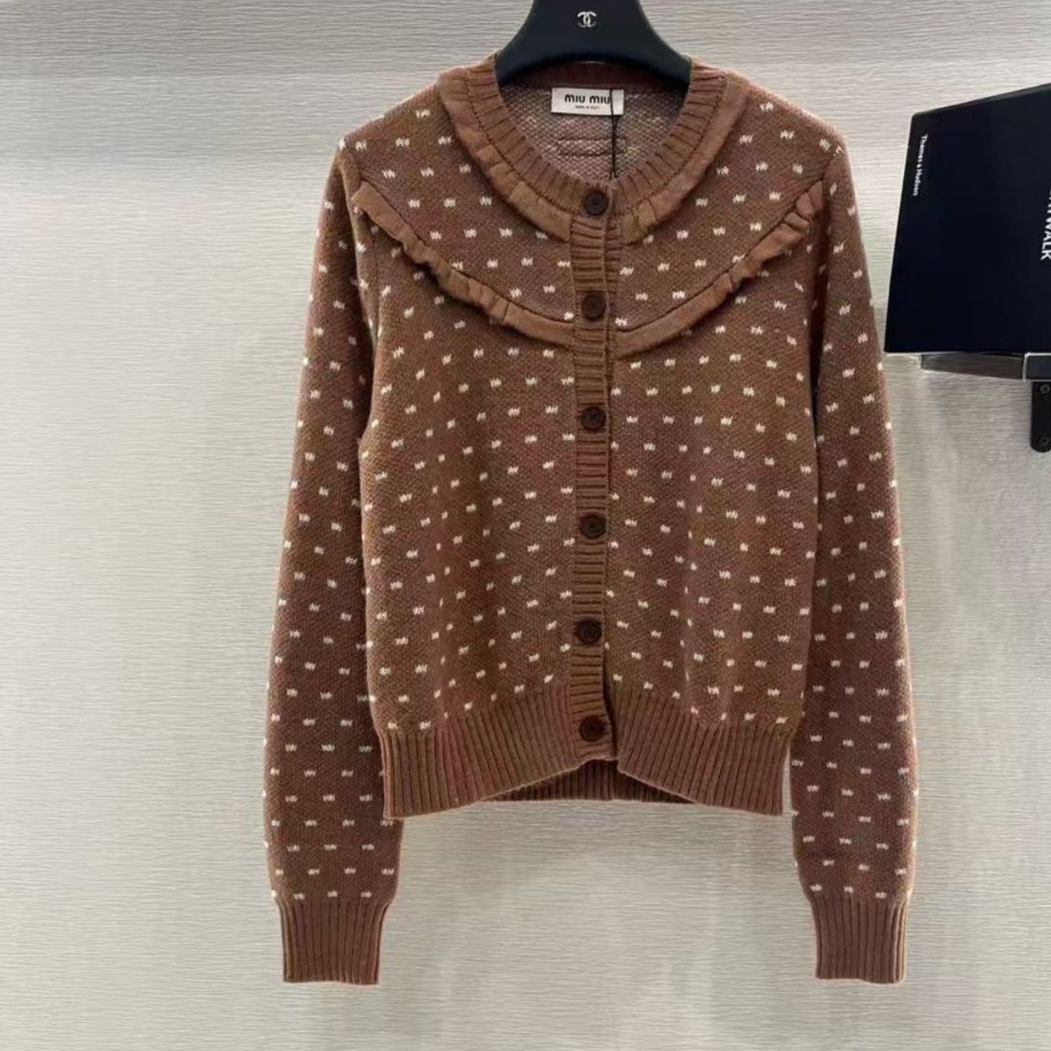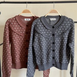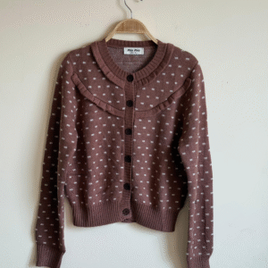 Embrace the playful yet sophisticated charm of Miu Miu with this exquisite Miu Miu Dotted Knit Cardigan. Meticulously crafted to “super master” quality standards, this piece is a testament to luxurious craftsmanship and avant-garde design. The sumptuous knit fabric offers a soft, cozy embrace, making it an irresistible layering essential.