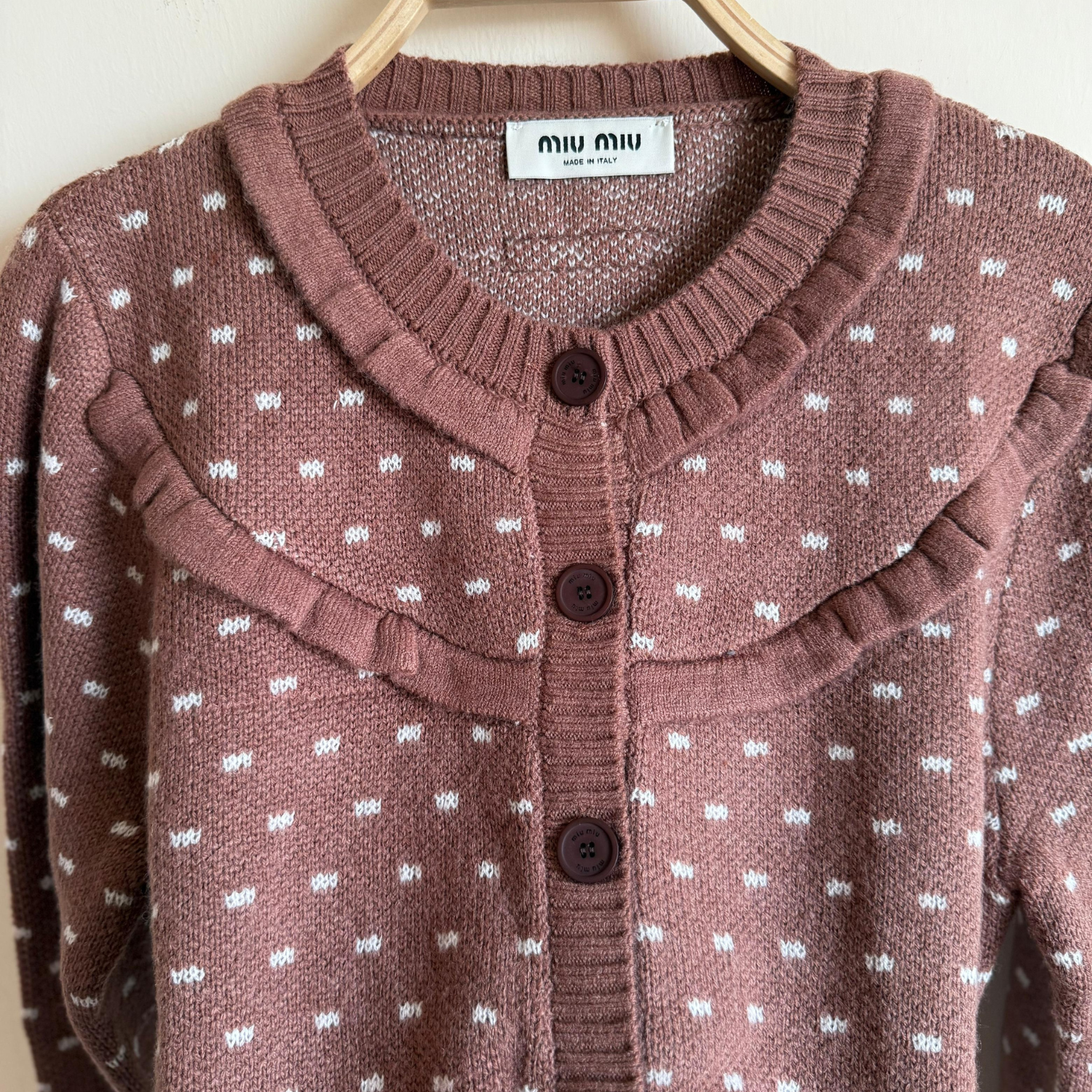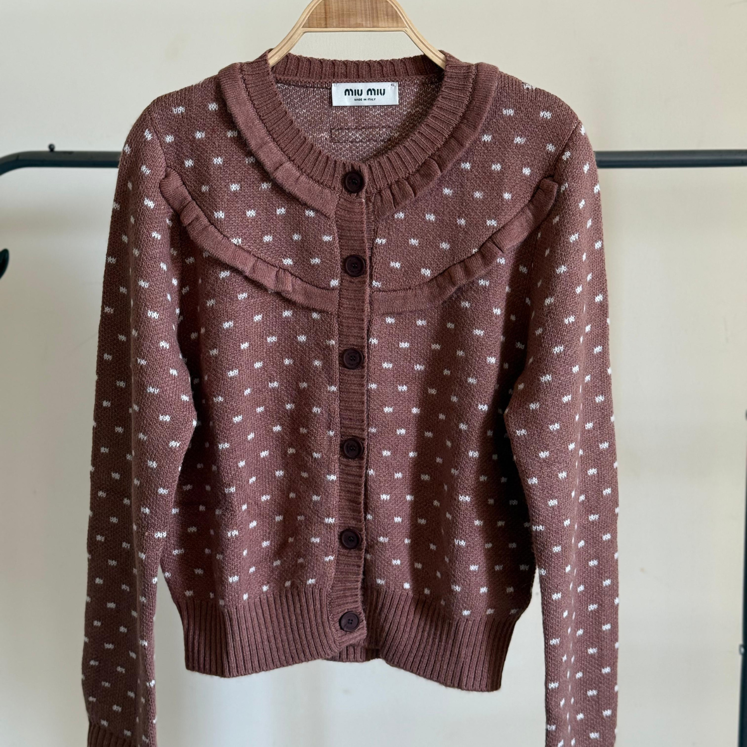 The cardigan features a whimsical all-over dotted pattern, a signature Miu Miu motif that adds a touch of quirky elegance. Finished with classic ribbed trims at the cuffs and hem, it ensures a perfect, structured fit. Whether draped over a daytime dress or paired with tailored trousers for an evening out, this cardigan is the ultimate statement piece for the fashion connoisseur who dares to blend comfort with high-impact style.