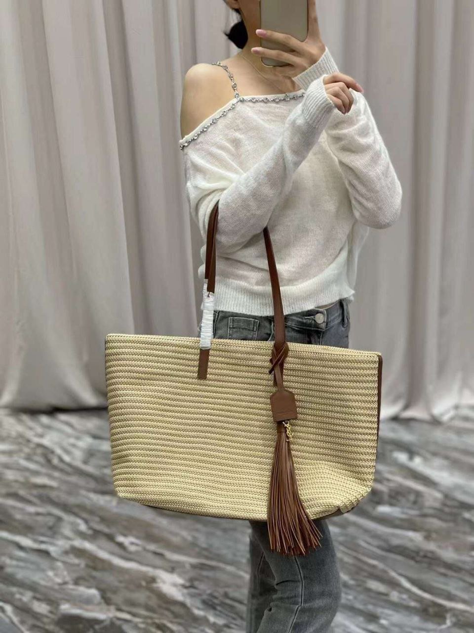 Luxury Saint Laurent Raffia Fringe Tote Bag – Super master quality, premium raffia, elegant fringe detailing, and iconic branding for a chic, bohemian-inspired look.